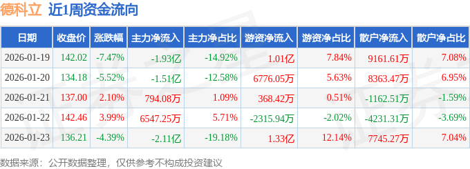 资金流向数据方面,本周德科立主力资金合计净流出4.82亿元,游资资金合计净流入2.83亿元,散户资金合计净流入1.99亿元。本周资金流向一览见下表: