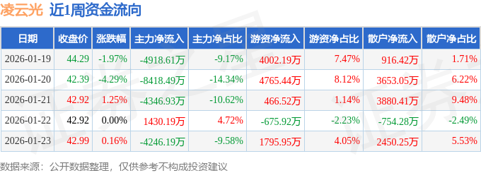 资金流向数据方面,本周凌云光主力资金合计净流出2.05亿元,游资资金合计净流入1.04亿元,散户资金合计净流入1.01亿元。本周资金流向一览见下表: