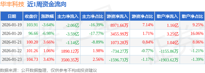 资金流向数据方面,本周华丰科技主力资金合计净流出6.26亿元,游资资金合计净流入1.12亿元,散户资金合计净流入5.14亿元。本周资金流向一览见下表:
