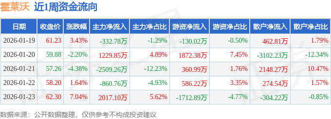 资金流向数据方面,本周霍莱沃主力资金合计净流出455.85万元,游资资金合计净流入976.68万元,散户资金合计净流出520.83万元。本周资金流向一览见下表: