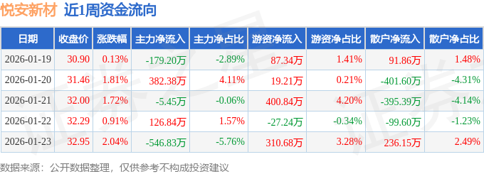 资金流向数据方面,本周悦安新材主力资金合计净流出222.25万元,游资资金合计净流入790.84万元,散户资金合计净流出568.59万元。本周资金流向一览见下表: