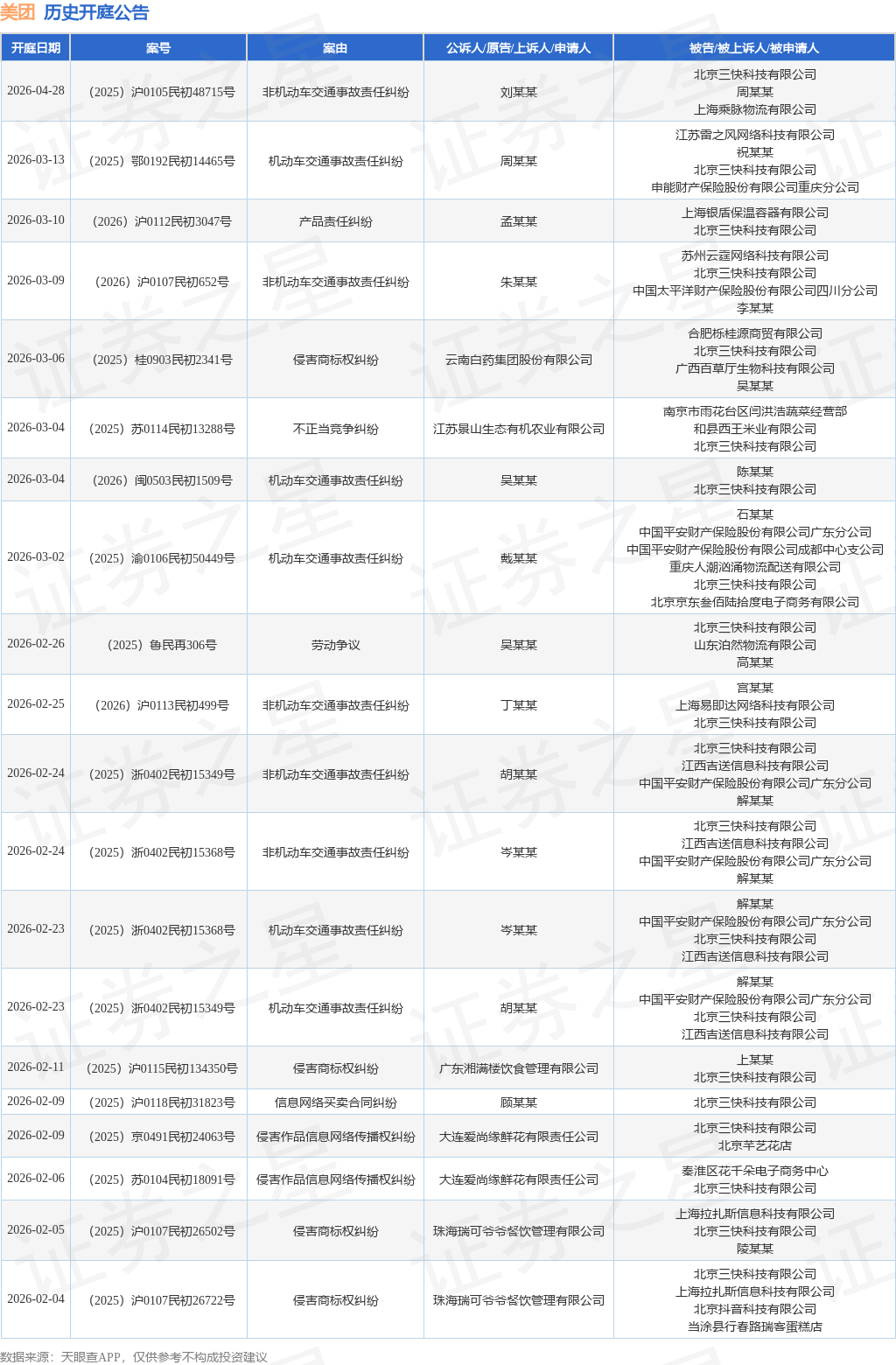 案号:(2025)沪0115民初44806号根据统计,近一年内以北京三快科技有限公司为当事人的历史开庭公告有679则,其中案由为“非机动车交通事故责任纠纷”的公告以187则居首,其次为“侵害商标权纠纷”有138则,“机动车交通事故责任纠纷”有92则。历史开庭公告(前20条)如下: