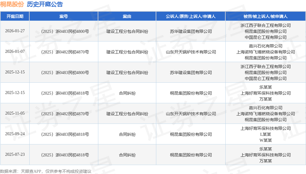 根据统计,近一年内以桐昆集团股份有限公司为当事人的历史开庭公告有7则,其中案由为“建设工程分包合同纠纷”的公告以4则居首,其次为“合同纠纷”有3则。历史开庭公告如下: