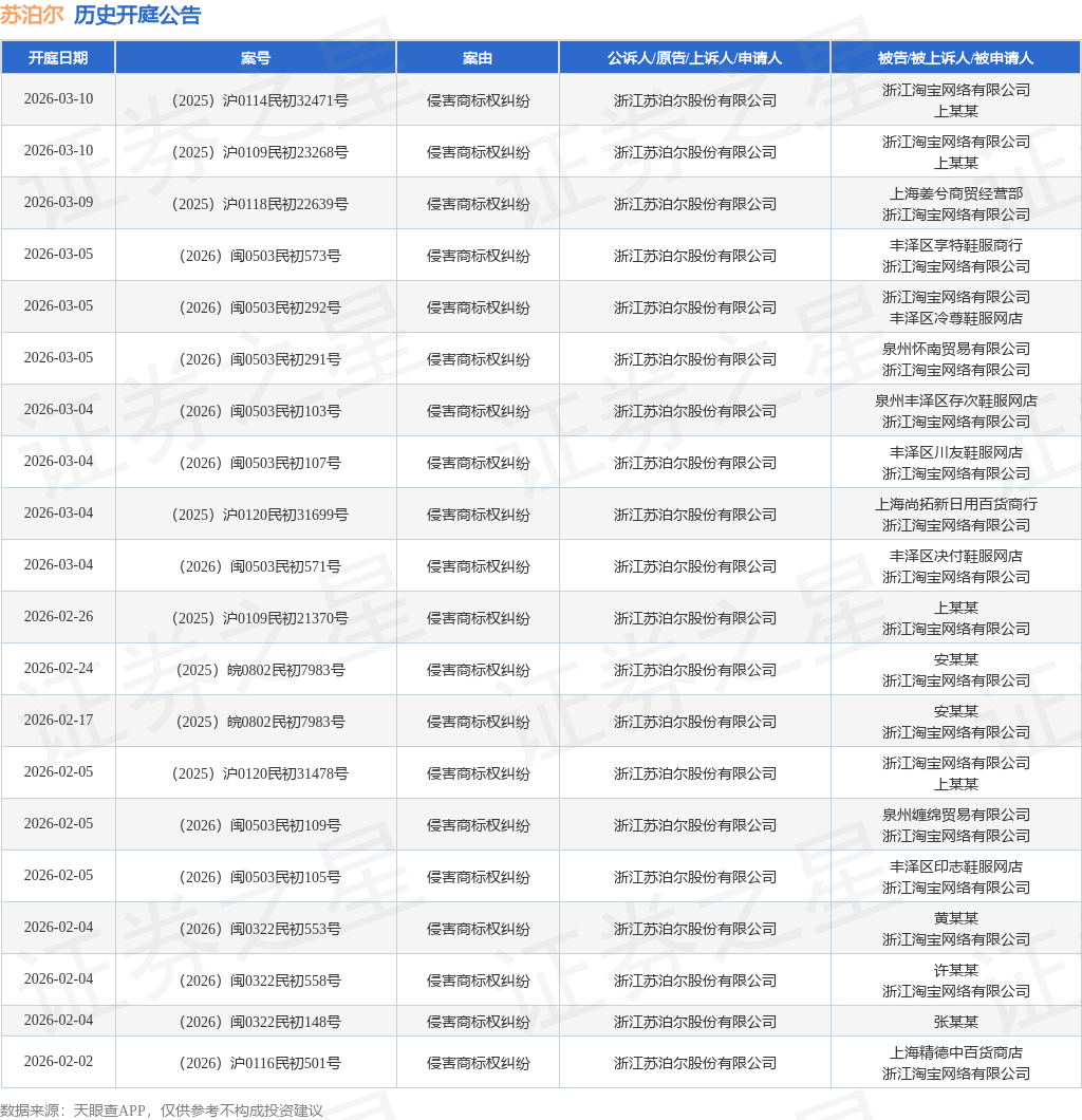 案号:(2026)闽0503民初291号根据统计,近一年内以浙江苏泊尔股份有限公司为当事人的历史开庭公告有169则,其中案由为“侵害商标权纠纷”的公告以145则居首,其次为“商标权权属、侵权纠纷”有5则,“不正当竞争纠纷”有4则。历史开庭公告(前20条)如下: