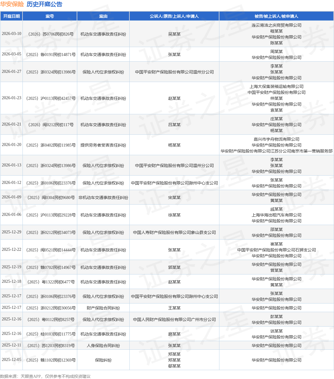 证券之星消息,根据天眼查APP显示,近日公布了一则华安财产保险股份有限公司作为被告/被上诉人的开庭公告,详细内容如下: