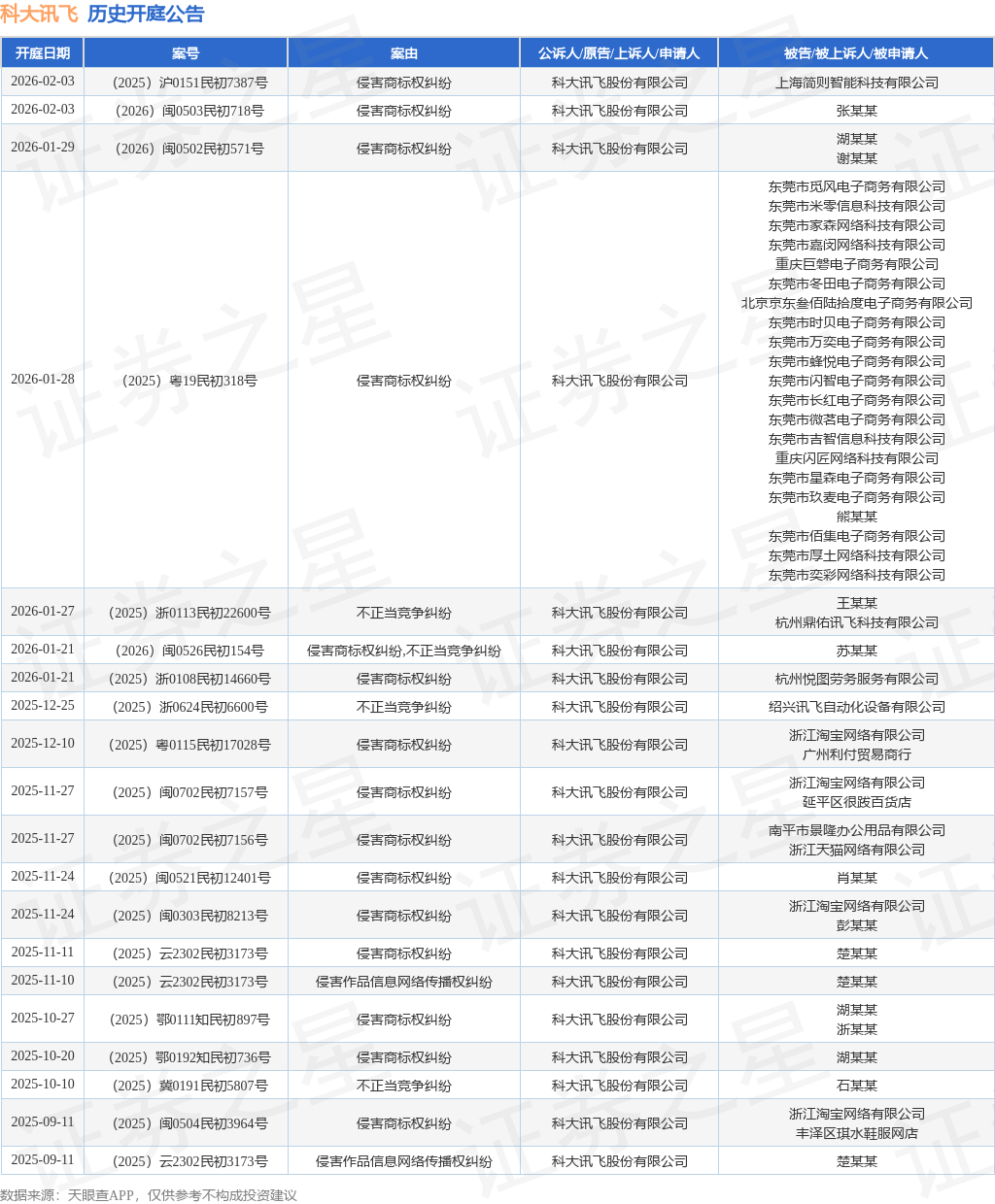 案号:(2025)浙0113民初22600号根据统计,近一年内以科大讯飞股份有限公司为当事人的历史开庭公告有45则,其中案由为“侵害商标权纠纷”的公告以26则居首,其次为“不正当竞争纠纷”有7则,“侵害作品信息网络传播权纠纷”有3则。历史开庭公告(前20条)如下: