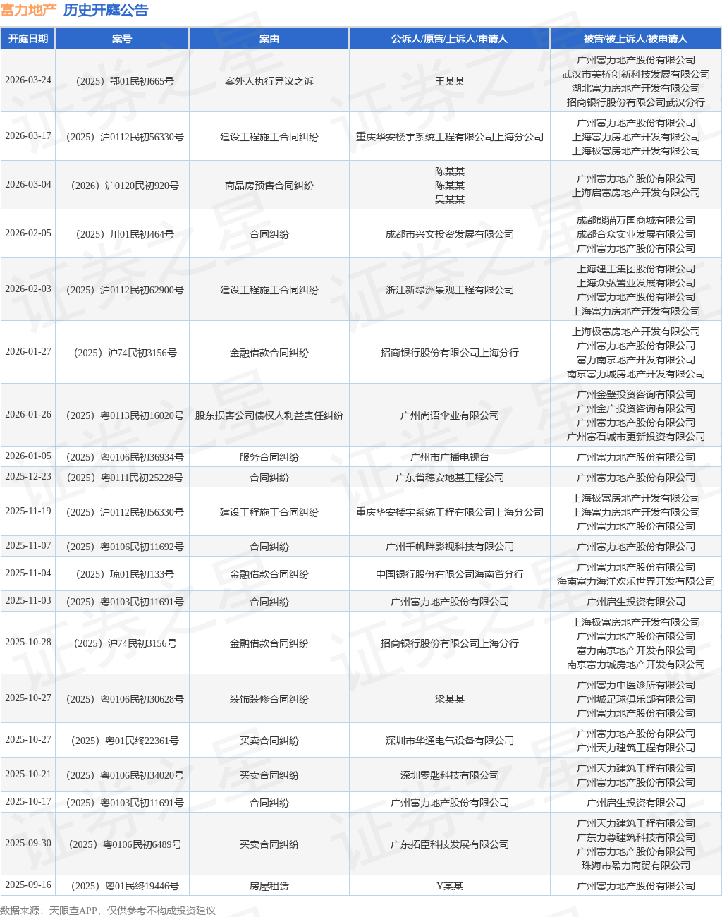 案号:(2025)沪74民初3156号根据统计,近一年内以广州富力地产股份有限公司为当事人的历史开庭公告有151则,其中案由为“买卖合同纠纷”的公告以40则居首,其次为“金融借款合同纠纷”有17则,“合同纠纷”有13则。历史开庭公告(前20条)如下: