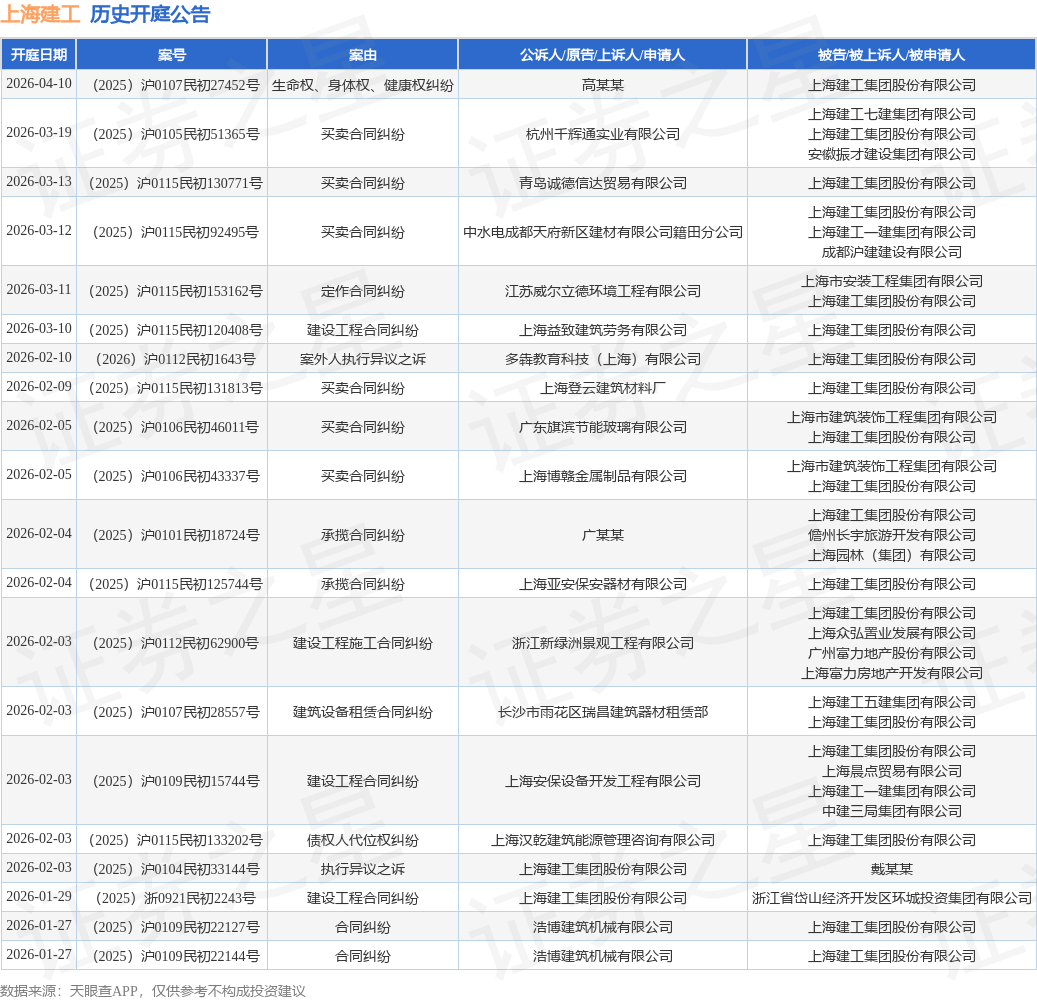 案号:(2025)沪0115民初131784号根据统计,近一年内以上海建工集团股份有限公司为当事人的历史开庭公告有472则,其中案由为“买卖合同纠纷”的公告以129则居首,其次为“建设工程施工合同纠纷”有83则,“案外人执行异议之诉”有50则。历史开庭公告(前20条)如下: