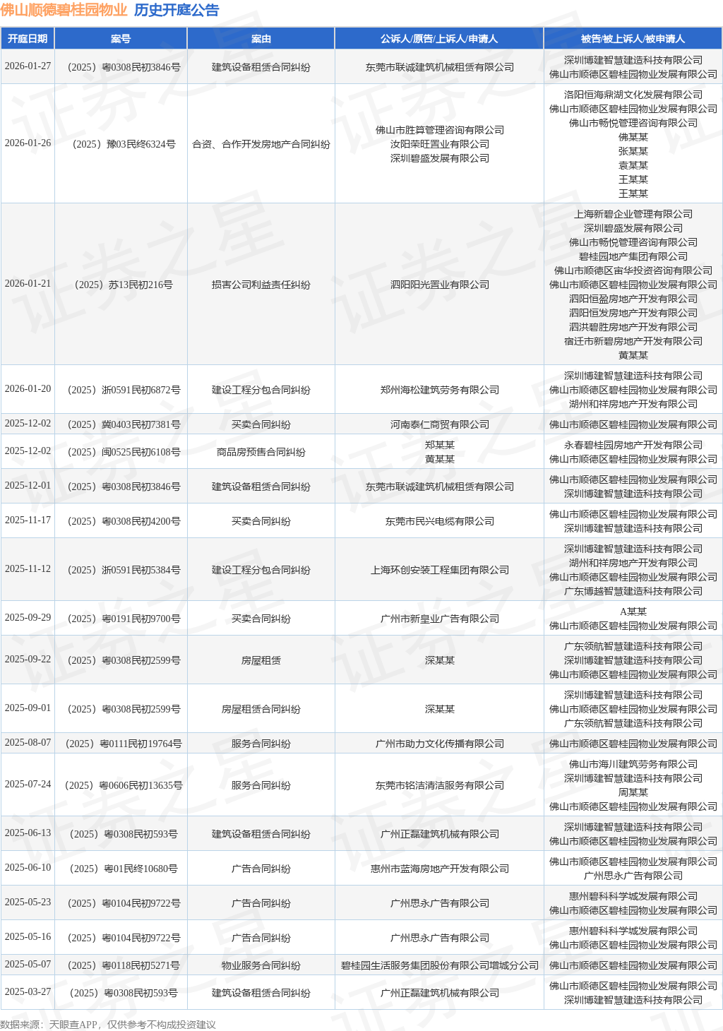 案号:(2025)粤0308民初3846号根据统计,近一年内以佛山市顺德区碧桂园物业发展有限公司为当事人的历史开庭公告有25则,其中案由为“广告合同纠纷”的公告以7则居首,其次为“建筑设备租赁合同纠纷”有4则,“买卖合同纠纷”有3则。历史开庭公告(前20条)如下: