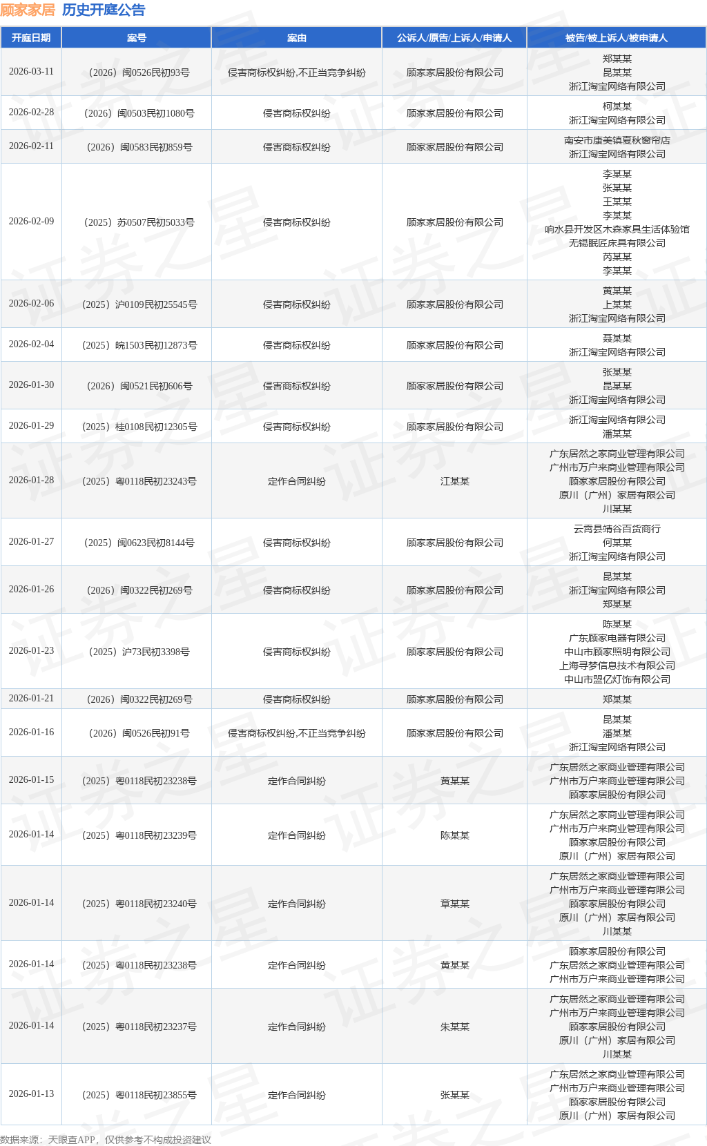 案号:(2025)闽0623民初8144号根据统计,近一年内以顾家家居股份有限公司为当事人的历史开庭公告有218则,其中案由为“侵害商标权纠纷”的公告以173则居首,其次为“定作合同纠纷”有10则,“商标权权属、侵权纠纷”有7则。历史开庭公告(前20条)如下: