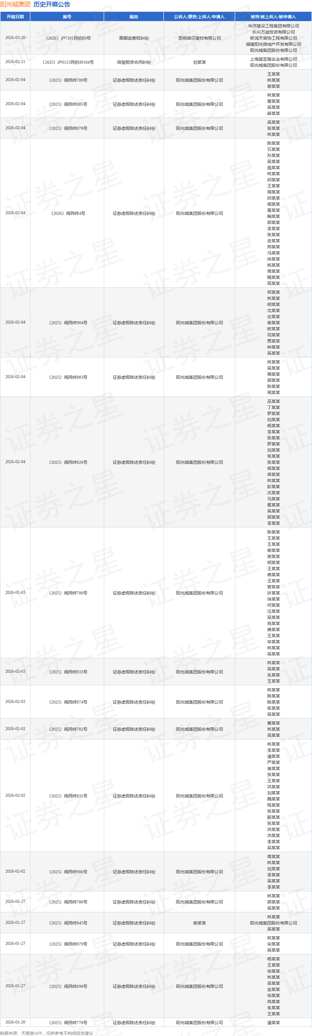 案号:(2025)闽民终845号根据统计,近一年内以阳光城集团股份有限公司为当事人的历史开庭公告有132则,其中案由为“证券虚假陈述责任纠纷”的公告以43则居首,其次为“买卖合同纠纷”有28则,“票据追索权纠纷”有13则。历史开庭公告(前20条)如下: