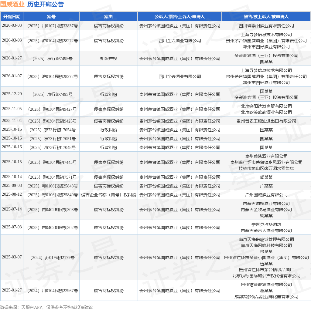 案号:(2025)京行终7495号根据统计,近一年内以贵州茅台镇国威酒业(集团)有限责任公司为当事人的历史开庭公告有18则,其中案由为“侵害商标权纠纷”的公告以12则居首,其次为“行政纠纷”有4则,“侵害企业名称(商号)权纠纷”有1则。历史开庭公告如下: