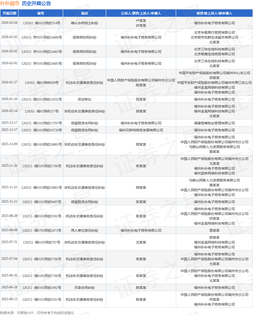 案号:(2026)闽01民终830号根据统计,近一年内以福州朴朴电子商务有限公司为当事人的历史开庭公告有35则,其中案由为“非机动车交通事故责任纠纷”的公告以14则居首,其次为“机动车交通事故责任纠纷”有8则,“侵害商标权纠纷”有3则。历史开庭公告(前20条)如下: