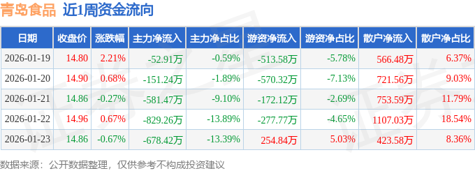 资金流向数据方面,本周青岛食品主力资金合计净流出2293.28万元,游资资金合计净流出1278.95万元,散户资金合计净流入3572.24万元。本周资金流向一览见下表: