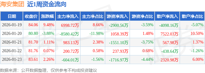 资金流向数据方面,本周海安集团主力资金合计净流出1001.87万元,游资资金合计净流出4872.32万元,散户资金合计净流入5874.19万元。本周资金流向一览见下表: