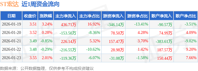 资金流向数据方面,本周ST宏达主力资金合计净流入173.43万元,游资资金合计净流出112.26万元,散户资金合计净流出61.17万元。本周资金流向一览见下表: