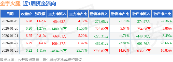 资金流向数据方面,本周金字火腿主力资金合计净流出3926.78万元,游资资金合计净流入2562.11万元,散户资金合计净流入1364.67万元。本周资金流向一览见下表: