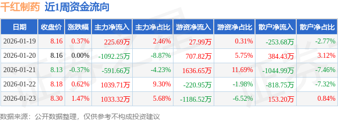 资金流向数据方面,本周千红制药主力资金合计净流入614.8万元,游资资金合计净流入964.99万元,散户资金合计净流出1579.79万元。本周资金流向一览见下表: