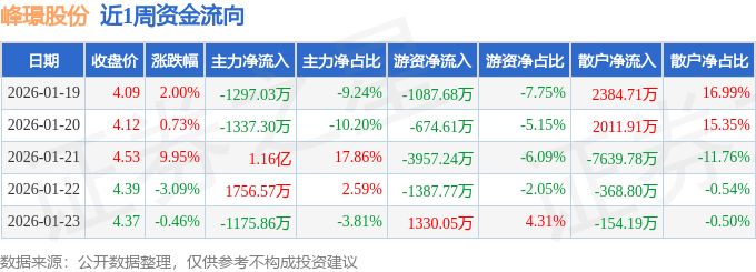 资金流向数据方面,本周峰璟股份主力资金合计净流入9543.4万元,游资资金合计净流出5777.25万元,散户资金合计净流出3766.15万元。本周资金流向一览见下表: