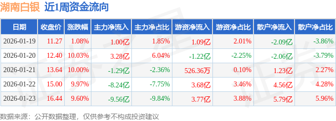 资金流向数据方面,本周湖南白银主力资金合计净流出14.8亿元,游资资金合计净流入7.37亿元,散户资金合计净流入7.43亿元。本周资金流向一览见下表:
