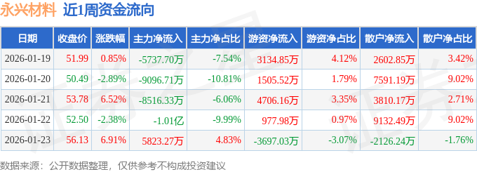 资金流向数据方面,本周永兴材料主力资金合计净流出2.76亿元,游资资金合计净流入6627.49万元,散户资金合计净流入2.1亿元。本周资金流向一览见下表: