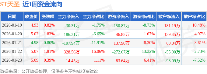 资金流向数据方面,本周ST天圣主力资金合计净流出71.55万元,游资资金合计净流出155.14万元,散户资金合计净流入226.69万元。本周资金流向一览见下表: