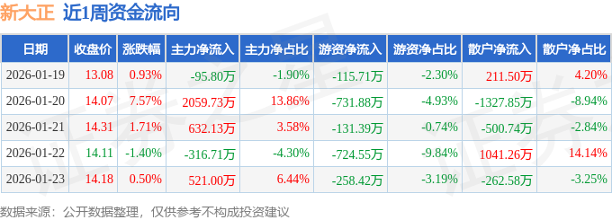 资金流向数据方面,本周新大正主力资金合计净流入2800.35万元,游资资金合计净流出1961.94万元,散户资金合计净流出838.41万元。本周资金流向一览见下表: