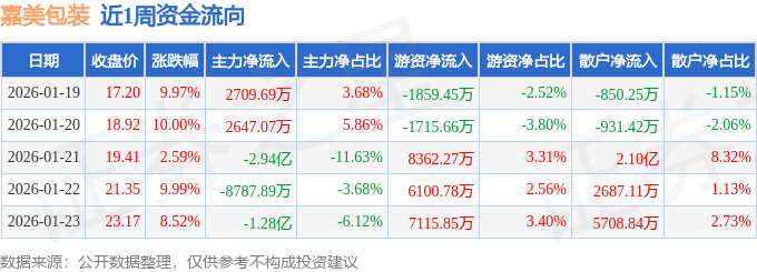 资金流向数据方面,本周嘉美包装主力资金合计净流出4.56亿元,游资资金合计净流入1.8亿元,散户资金合计净流入2.76亿元。本周资金流向一览见下表: