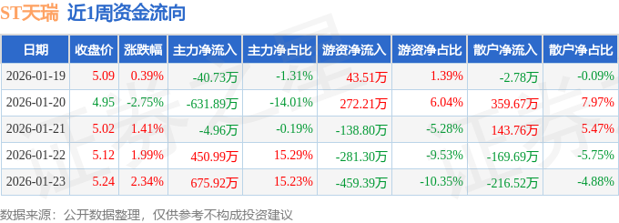 资金流向数据方面,本周ST天瑞主力资金合计净流入449.33万元,游资资金合计净流出563.77万元,散户资金合计净流入114.44万元。本周资金流向一览见下表:
