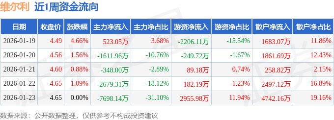资金流向数据方面,本周维尔利主力资金合计净流出1.18亿元,游资资金合计净流入771.52万元,散户资金合计净流入1.1亿元。本周资金流向一览见下表: