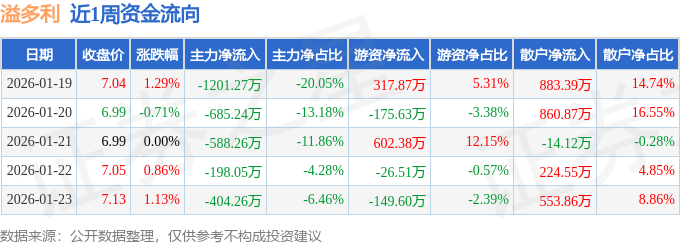 资金流向数据方面,本周溢多利主力资金合计净流出3077.07万元,游资资金合计净流入568.51万元,散户资金合计净流入2508.55万元。本周资金流向一览见下表: