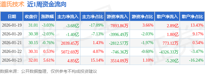 资金流向数据方面,本周道氏技术主力资金合计净流入4736.83万元,游资资金合计净流入3852.53万元,散户资金合计净流出8589.36万元。本周资金流向一览见下表: