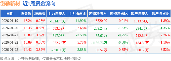 资金流向数据方面,本周岱勒新材主力资金合计净流出1596.53万元,游资资金合计净流出1420.26万元,散户资金合计净流入3016.79万元。本周资金流向一览见下表: