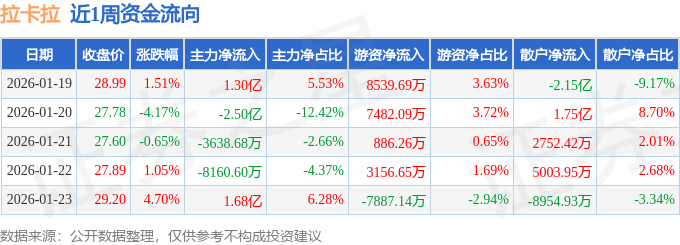 资金流向数据方面,本周拉卡拉主力资金合计净流出6949.68万元,游资资金合计净流入1.22亿元,散户资金合计净流出5227.86万元。本周资金流向一览见下表: