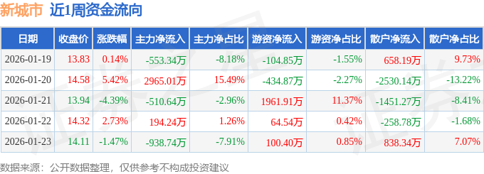资金流向数据方面,本周新城市主力资金合计净流入1156.52万元,游资资金合计净流入1587.14万元,散户资金合计净流出2743.66万元。本周资金流向一览见下表: