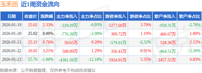 资金流向数据方面,本周玉禾田主力资金合计净流出4918.49万元,游资资金合计净流入3288.73万元,散户资金合计净流入1629.76万元。本周资金流向一览见下表: