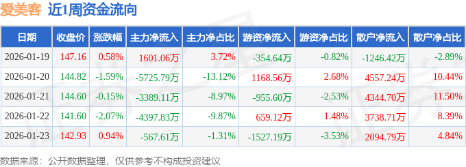 资金流向数据方面,本周爱美客主力资金合计净流出1.25亿元,游资资金合计净流出1009.75万元,散户资金合计净流入1.35亿元。本周资金流向一览见下表: