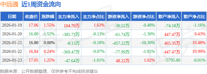 资金流向数据方面,本周中远通主力资金合计净流出706.28万元,游资资金合计净流出579.25万元,散户资金合计净流入1285.53万元。本周资金流向一览见下表: