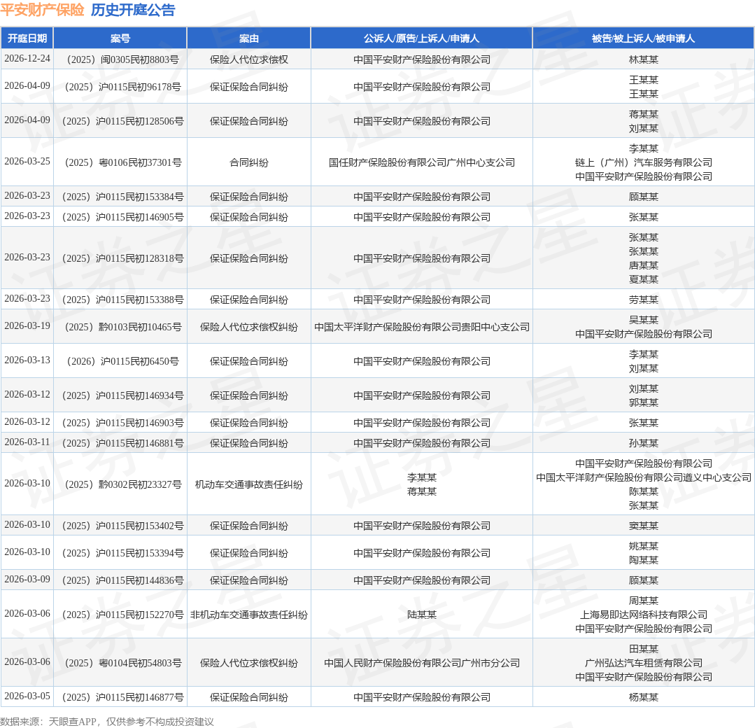 案号:(2025)沪0115民初146907号根据统计,近一年内以中国平安财产保险股份有限公司为当事人的历史开庭公告有1930则,其中案由为“机动车交通事故责任纠纷”的公告以930则居首,其次为“保证保险合同纠纷”有251则,“保险人代位求偿权纠纷”有163则。历史开庭公告(前20条)如下: