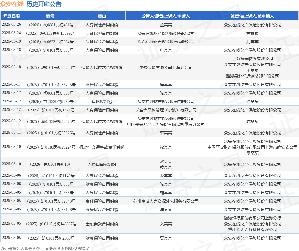 案号:(2025)浙0683民初10307号根据统计,近一年内以众安在线财产保险股份有限公司为当事人的历史开庭公告有4724则,其中案由为“保证保险合同纠纷”的公告以3077则居首,其次为“人身保险合同纠纷”有617则,“保险人代位求偿权纠纷”有364则。历史开庭公告(前20条)如下: