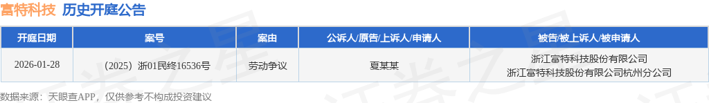 根据统计,近一年内以浙江富特科技股份有限公司为当事人的历史开庭公告有1则,其中案由为“劳动争议”的公告以1则居首。历史开庭公告如下: