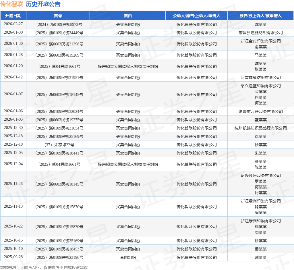 案号:(2025)浙0603民初19269号根据统计,近一年内以传化智联股份有限公司为当事人的历史开庭公告有34则,其中案由为“买卖合同纠纷”的公告以29则居首,其次为“股东损害公司债权人利益责任纠纷”有4则,“合同纠纷”有1则。历史开庭公告(前20条)如下: