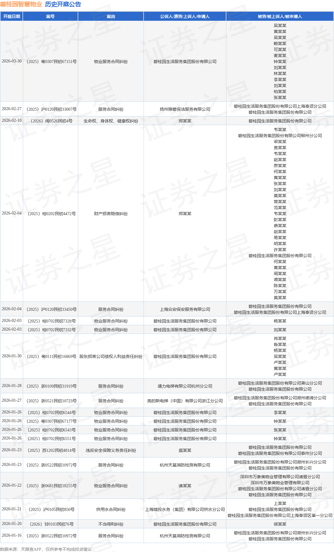 案号:(2025)浙0109民初31919号根据统计,近一年内以碧桂园生活服务集团股份有限公司为当事人的历史开庭公告有60则,其中案由为“物业服务合同纠纷”的公告以25则居首,其次为“服务合同纠纷”有21则,“违反安全保障义务责任纠纷”有3则。历史开庭公告(前20条)如下: