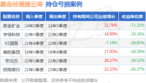 提云涛管理的中信保诚至瑞混合A基金在24年2季度买入紫金矿业,在持有1个季度后在24年3季度卖出。持有期间的估算收益率为-71.31%,持有期间紫金矿业在2023年到2024年的年报归属净利润增幅达51.76%。