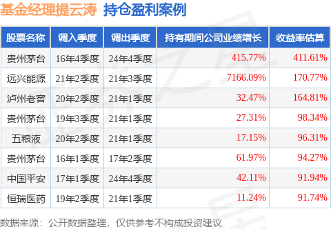 提云涛管理的中信保诚至瑞混合A基金在16年4季度买入贵州茅台,在持有8年又0个季度后在24年4季度卖出。持有期间的估算收益率为411.61%,持有期间贵州茅台在2016年到2024年的年报归属净利润增幅达415.77%。