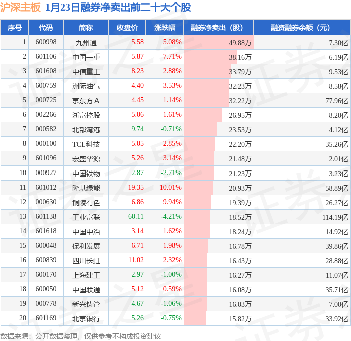 沪深主板融券净卖出前三分别为:九州通(600998)融券净卖出49.88万股、中国一重(601106)融券净卖出38.16万股、中信重工(601608)融券净卖出33.79万股,前20具体见下表: