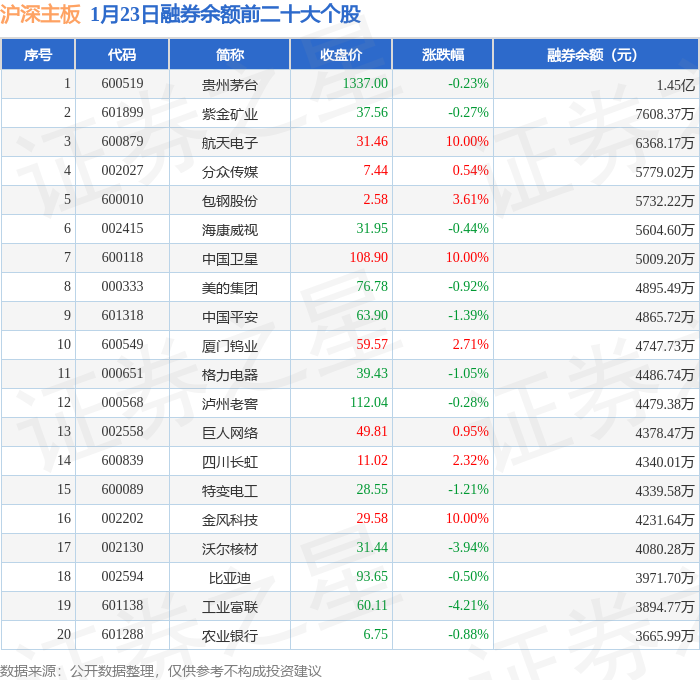 沪深主板融券余额前三分别为:贵州茅台(600519)融券余额1.45亿元、紫金矿业(601899)融券余额7608.37万元、航天电子(600879)融券余额6368.17万元,前20具体见下表: