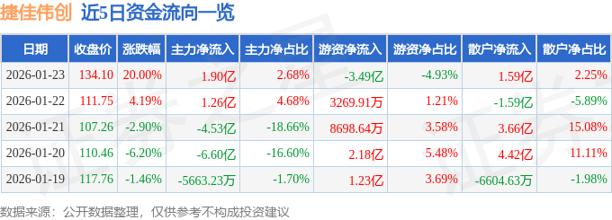 证券之星消息,截至2026年1月23日收盘,捷佳伟创(300724)报收于134.1元,上涨20.0%,涨停,换手率18.96%,成交量54.55万手,成交额70.92亿元。