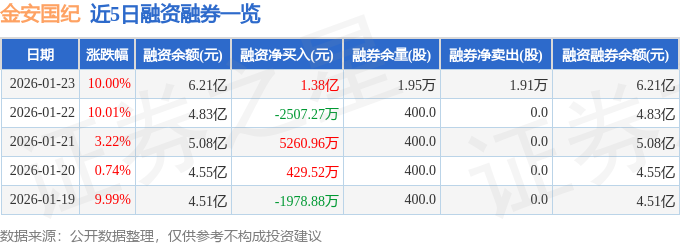 证券之星消息,截至2026年1月23日收盘,金安国纪(002636)报收于25.63元,上涨10.0%,已连续涨停2天,换手率11.2%,成交量81.12万手,成交额20.51亿元。