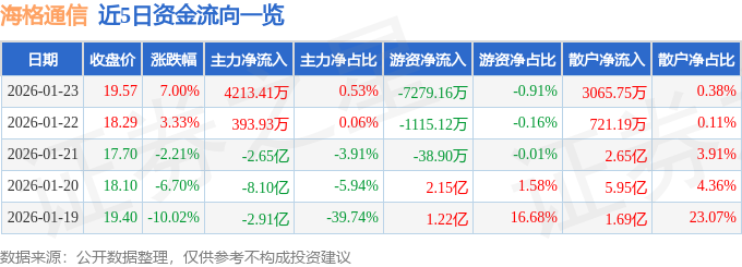 证券之星消息,截至2026年1月23日收盘,海格通信(002465)报收于19.57元,上涨7.0%,换手率16.79%,成交量416.07万手,成交额79.97亿元。